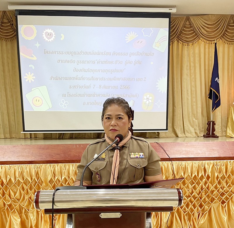 7 กันยายน 2566 ณ โรงเรียนบ้านหน้าควนลัง (ราษฎร์สามัคคี) นายอุทัย กาญจนะ ผอ.สพป.สงขลา เขต 2 มอบหมายให้ ดร.กฤศรดา ศศิธนาดุล รอง ผอ.สพป.สงขลา เขต 2 ประธานเปิดและบรรยายพิเศษการจัดอบรมโครงการเสริมสร้างศักยภาพการดำเนินงานระบบการดูแลช่วยเหลือนักเรียน ประจำปีงบประมาณ 2566 กิจกรรมค่ายทักษะชีวิต รู้คิด รู้ทัน ป้องกันยาเสพติด สำหรับนักเรียน(โรงเรียนขยายโอกาส)ในสังกัด จำนวน 108 คน 18 โรงเรียน ได้มีความรู้ความเข้าใจ เสริมสร้างภูมิคุ้มกัน ลดโอกาสเข้าไปยุ่งเกี่ยวกับยาเสพติด หรืออบายมุขต่าง ๆ นักเรียนสามารถคิดวิเคราะห์ ยับยังชั่งใจ รู้จักปฏิเสธ แก้ไขปัญหาเป็น รู้ทันข้อมูลข่าวสาร ตัดสินใจแก้ปัญหาอย่างมีหลักเกณฑ์และสร้างสรรค์ นำความรู้ที่ได้รับไปประยุกต์ใช้ในชีวิตประจำวันและอยู่ในสังคมได้อย่างมีความสุข มั่นคงและปลอดภัย โดยมี นายมิตร ศิริธรรม ผู้อำนวยการโรงเรียนบ้านบางเหรียง กล่าวรายงาน |