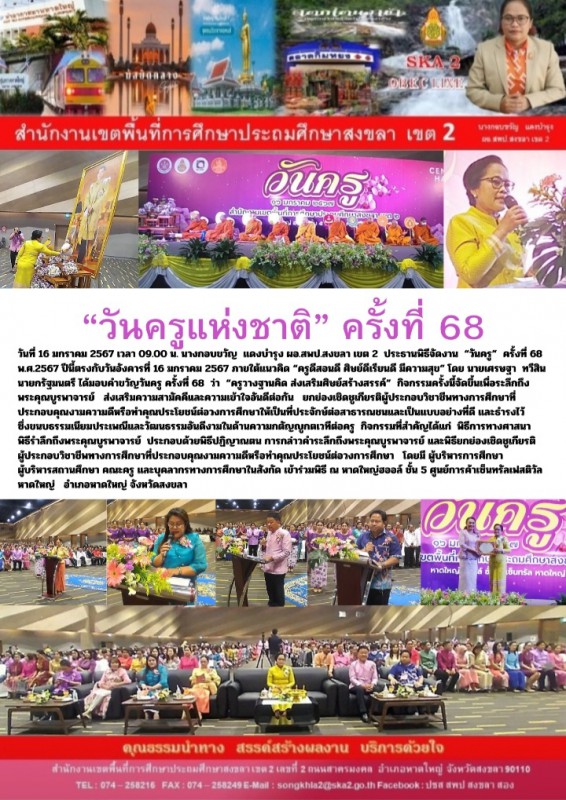 วันที่ 16 มกราคม 2567 เว วลา 09.00 น. ดร.เรวดี เชาวนาสัย ผู้อำนวยการสถานศึกษา พร้อมด้วย ว่าที่ ร.ต.อดิสรณ์ โต๊ะมะสะหัด รองผู้อำนวยการสถานศึกษา และคณะครูบุคลากรโรงเรียนบ้านหน้าควนลัง(ราษฎร์สามัคคี) เข้าร่วมงาน "วันครู" ครั้งที่ 68 ประจำปี 2567 สพป.สงขลา เขต 2 ภายใต้แนวคิด "ครูคีสอนดี ศิษย์ดีเรียนดี มีความสุข" โดย นายเศรษฐา ทรีสิน นายกรัฐมนตรี ได้มอบคำขวัญวันครู ครั้งที่ 68 ว่า "ครูวางฐานคิด ส่งเสริมศิษย์สร้างสรรค์" กิจกรรมที่สำคัญได้แก่ พิธีการทางศาสนา พิธีร่ำลึกถึงพรคุณบูรพาจารย์ ประกอบด้วยพิธีปฏิญาณตน การกลำวคำระลึกถึงพระคุณบูรพาจารย์ และพิธียกย่องเชิดชูเกียรติ
