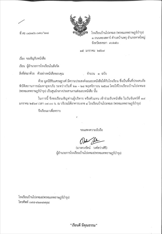 วันที่จันทร์ ที่ 19 ม.ค. 69 รองอดิสรณ์ โต๊ะมะสะหัด รองู้อำนวยการสถานศึกษา เข้าร่วมกิจกรรมรับมอบหนังสือให้กับห้องสมุดโรงเรียนจากมูลนิธิชินเศรษฐวงศ์ คิดเป็นมูลค่า 5,016 บาท ณ โรงเรียนบ้านโปะหมอ (พรหมเทพราษฎร์บำรุง) โรงเรียนบ้านหน้าควนลัง(ราษฎร์สามัคคี)ขอขอบคุณ มา ณ โอกาสนี้ |