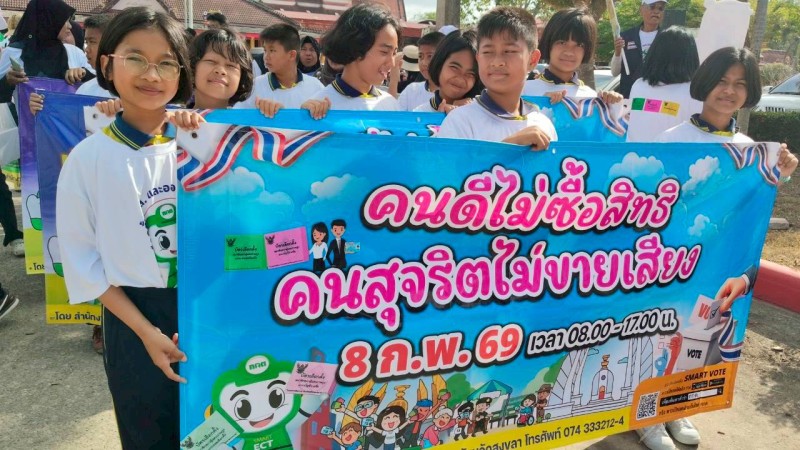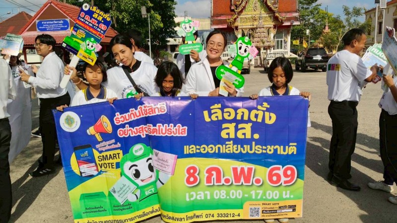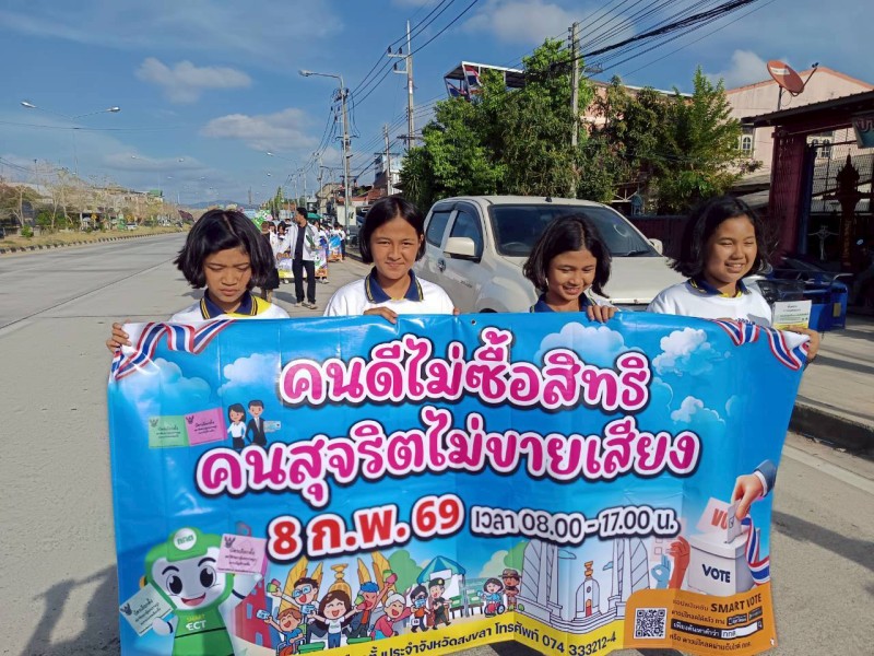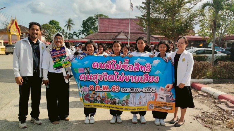 วันพฤหัสบดีที่ 5 กุมภาพันธ์ 2569 เวลา 15.00 น. นายไพจิตร์ จิตต์โสภณ ผู้อำนวยการสถานศึกษา มอบหมายให้ ว่าที่ ร.ต.อดิสรณ์ โต๊ะมะสะหัด รองผู้อำนวยการสถานศึกษาพร้อมด้วยตัวแทนครูและนักเรียนสภานักเรียนโรงเรียนบ้านหน้าควนลัง เข้าร่วมกิจกรรมกับเทศบาลเมืองควนลังจัดกิจกรรมเดินรณรงค์การเลือกตั้งสมาชิกสภาผู้แทนราษฎรเป็นการทั่วไป (สส.) และการออกเสียงประชามติ เพื่อเป็นการส่งเสริมการปกครองในระบอบประชาธิปไตย และประชาสัมพันธ์การเลือกตั้งของจังหวัดสงขลา เขตเลือกตั้งที่ 9 ให้ประชาชนชาวตำบลควนลัง ได้เล็งเห็นถึงความสำคัญของการเลือกตั้งและออกมาใช้สิทธิเลือกตั้งตามหน้าที่ให้มากที่สุด ในวันอาทิตย์ที่ 8 กุมภาพันธ์ 2569 ตั้งแต่เวลา 08.00 น.- 17.00 น. ณ หน่วยเลือกตั้งที่ท่านมีรายชื่อ อย่างพร้อมเพรียงกัน