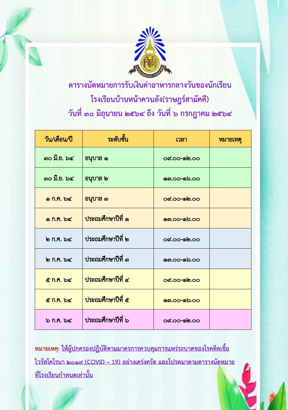 การรับเงินค่าอาหารกลางวันระหว่างวันที่ 30 มิ.ย. - 6 ก.ค. 2564
