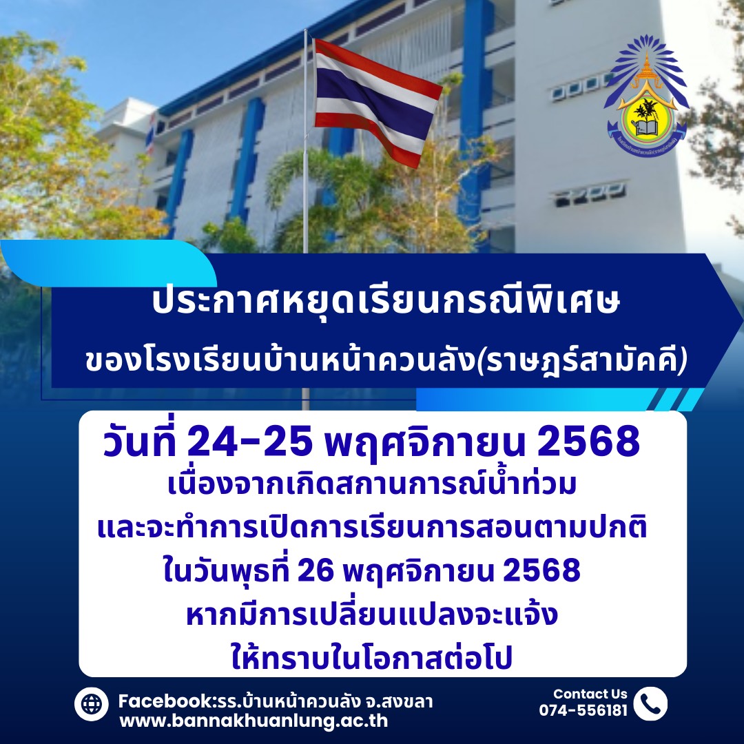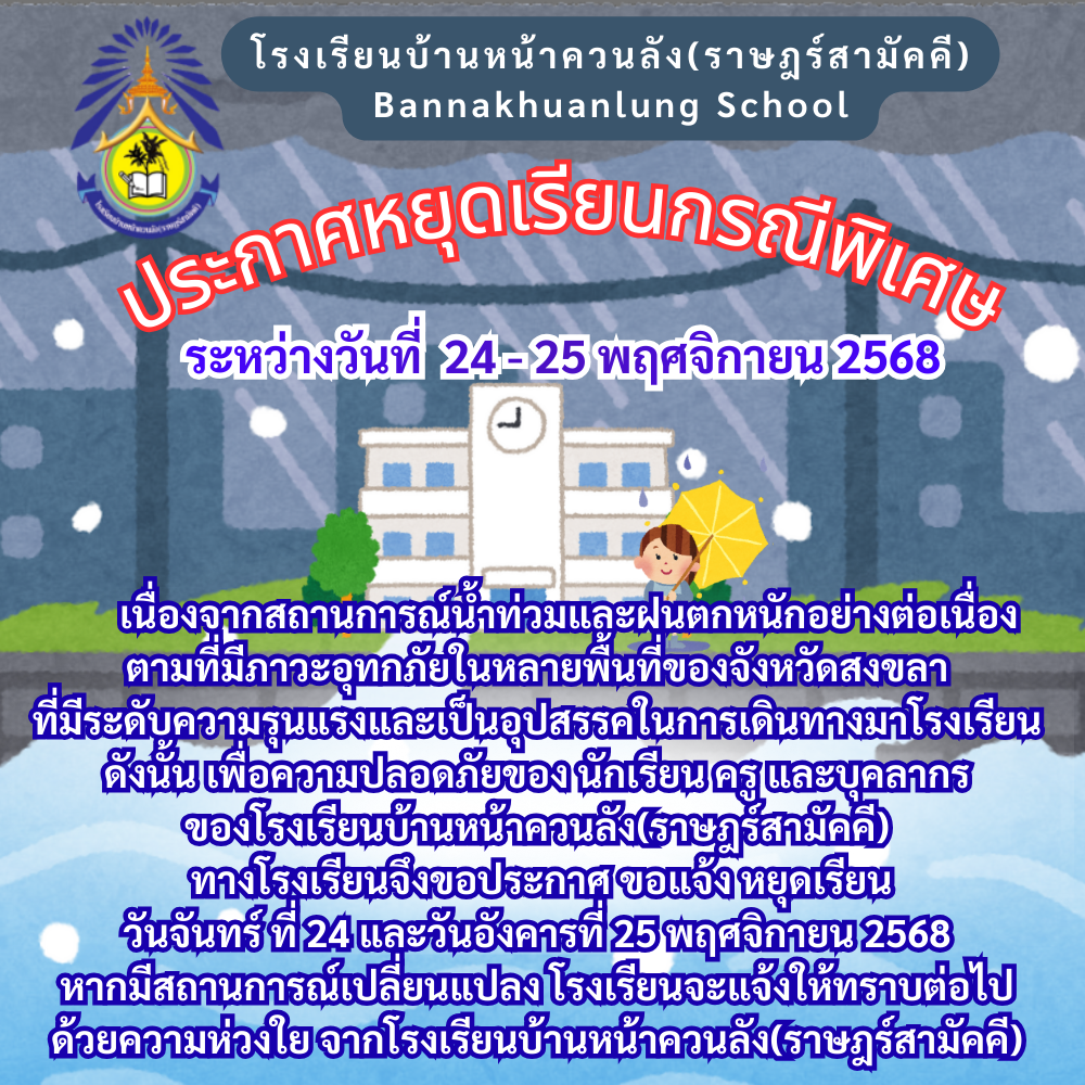 ประกาศหยุดเรียนกรณีพิเศษ ฉบับที่ 2 24 พ.ย. 68